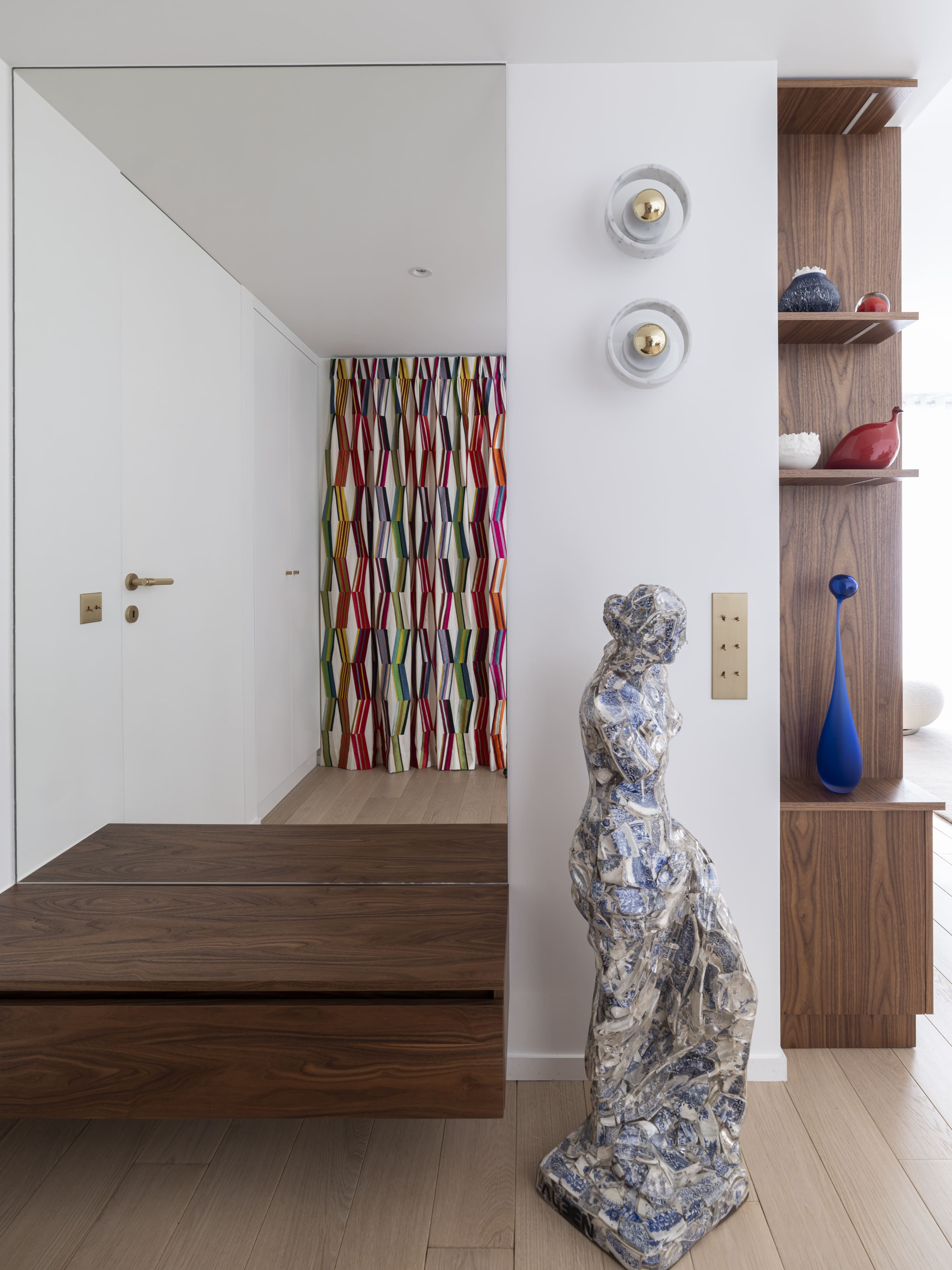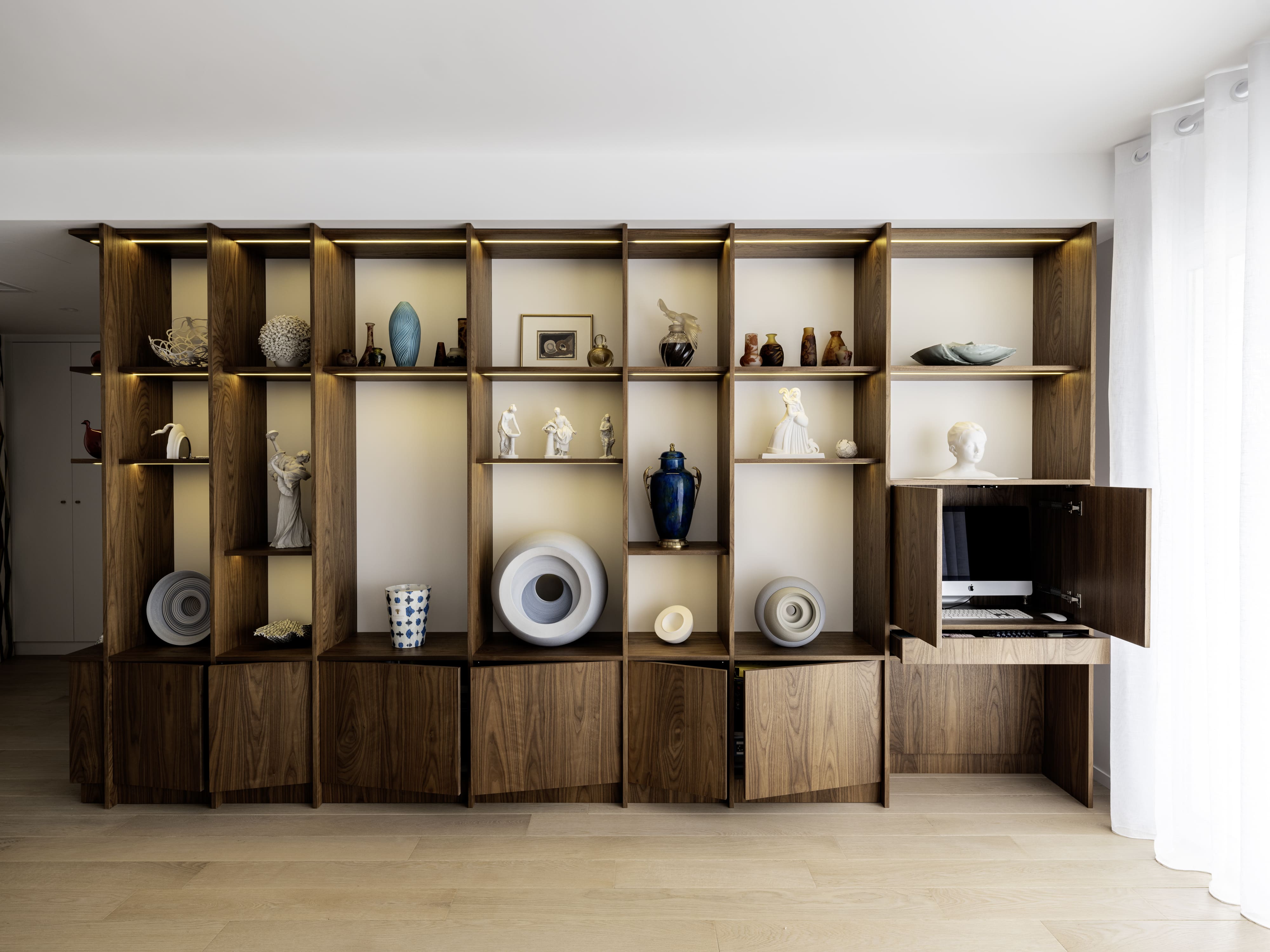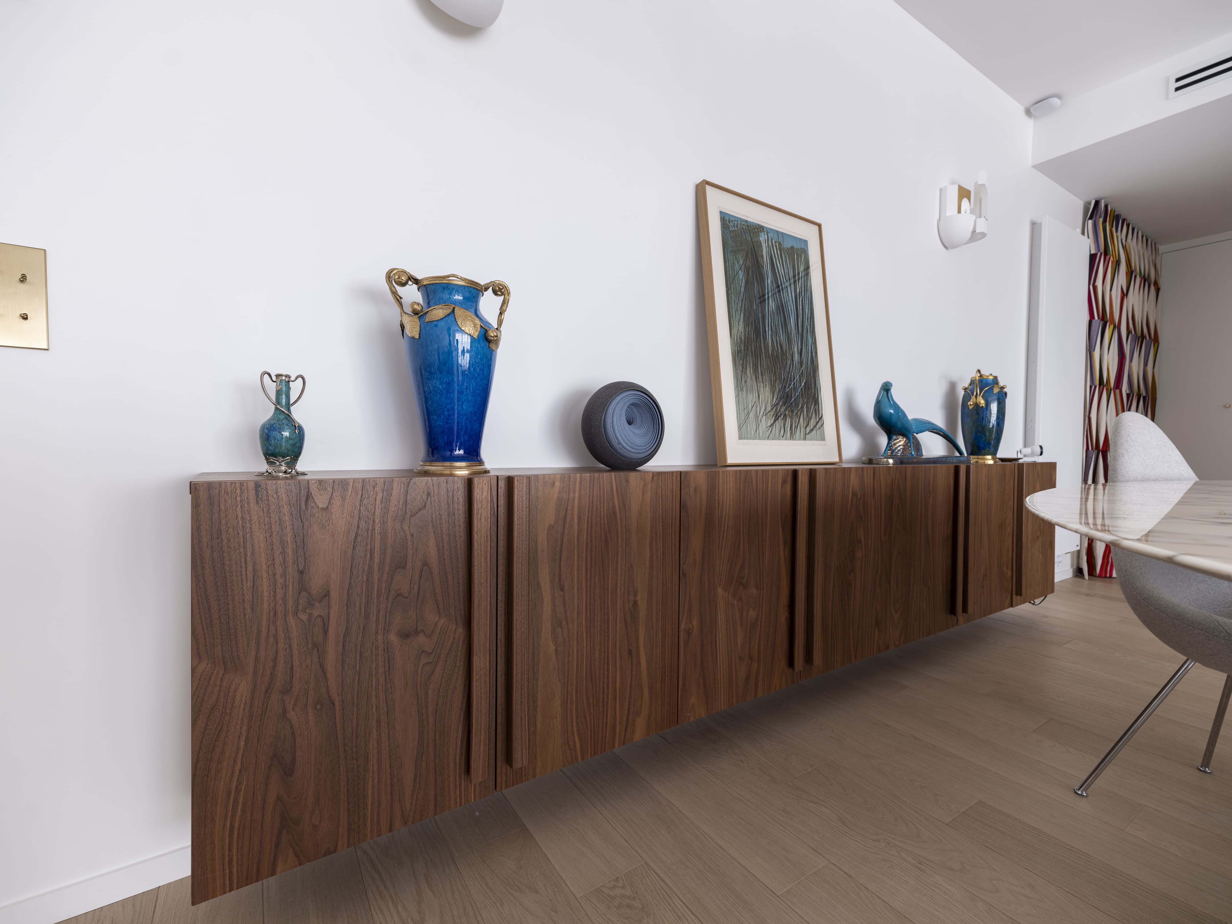 Aménagement intérieur sur mesure d’un appartement contemporain, alliant bois noble, pierre naturelle et finitions haut de gamme. Chaque élément a été conçu pour offrir un équilibre parfait entre esthétique, fonctionnalité et intégration dans l’espace.