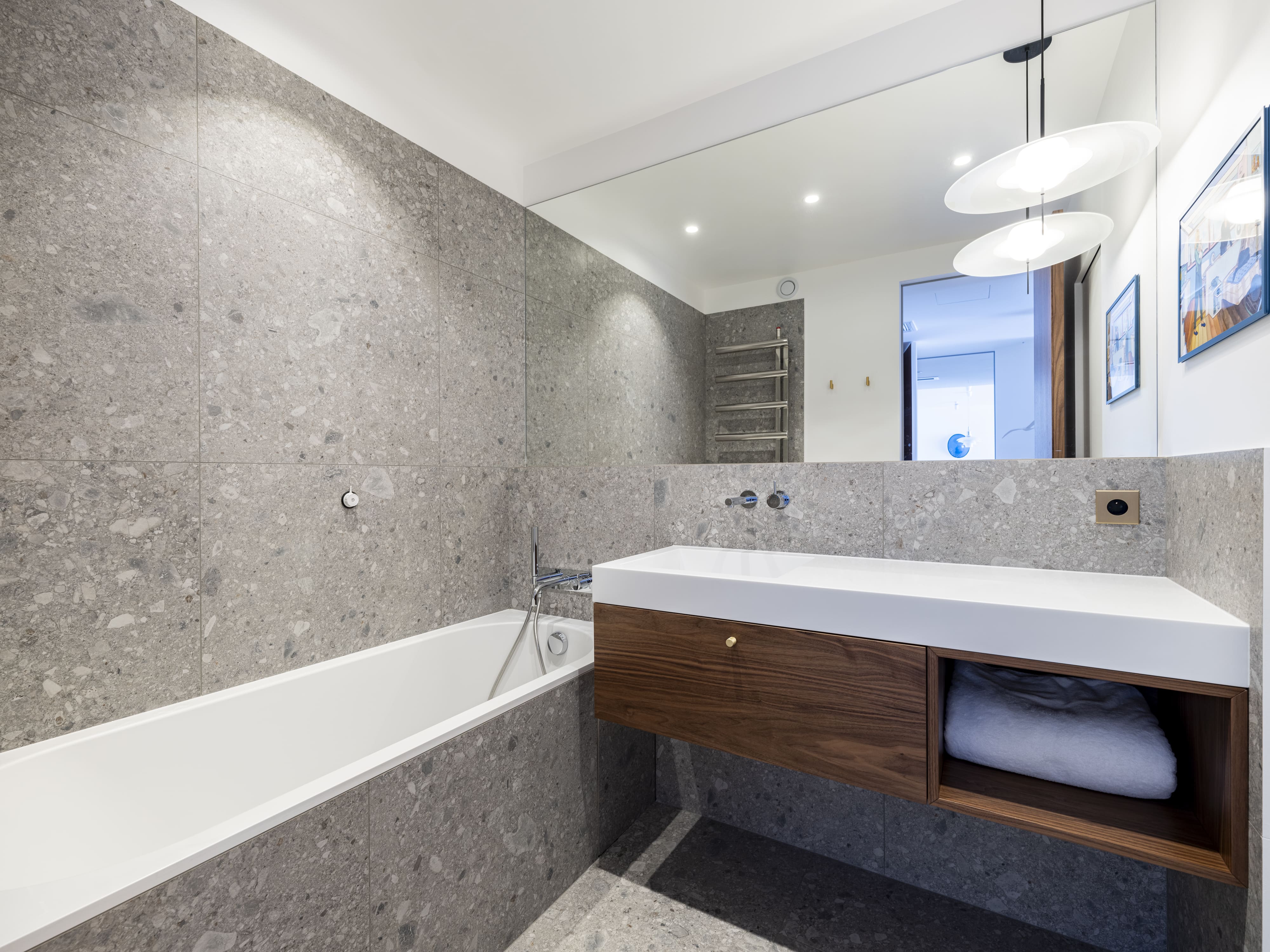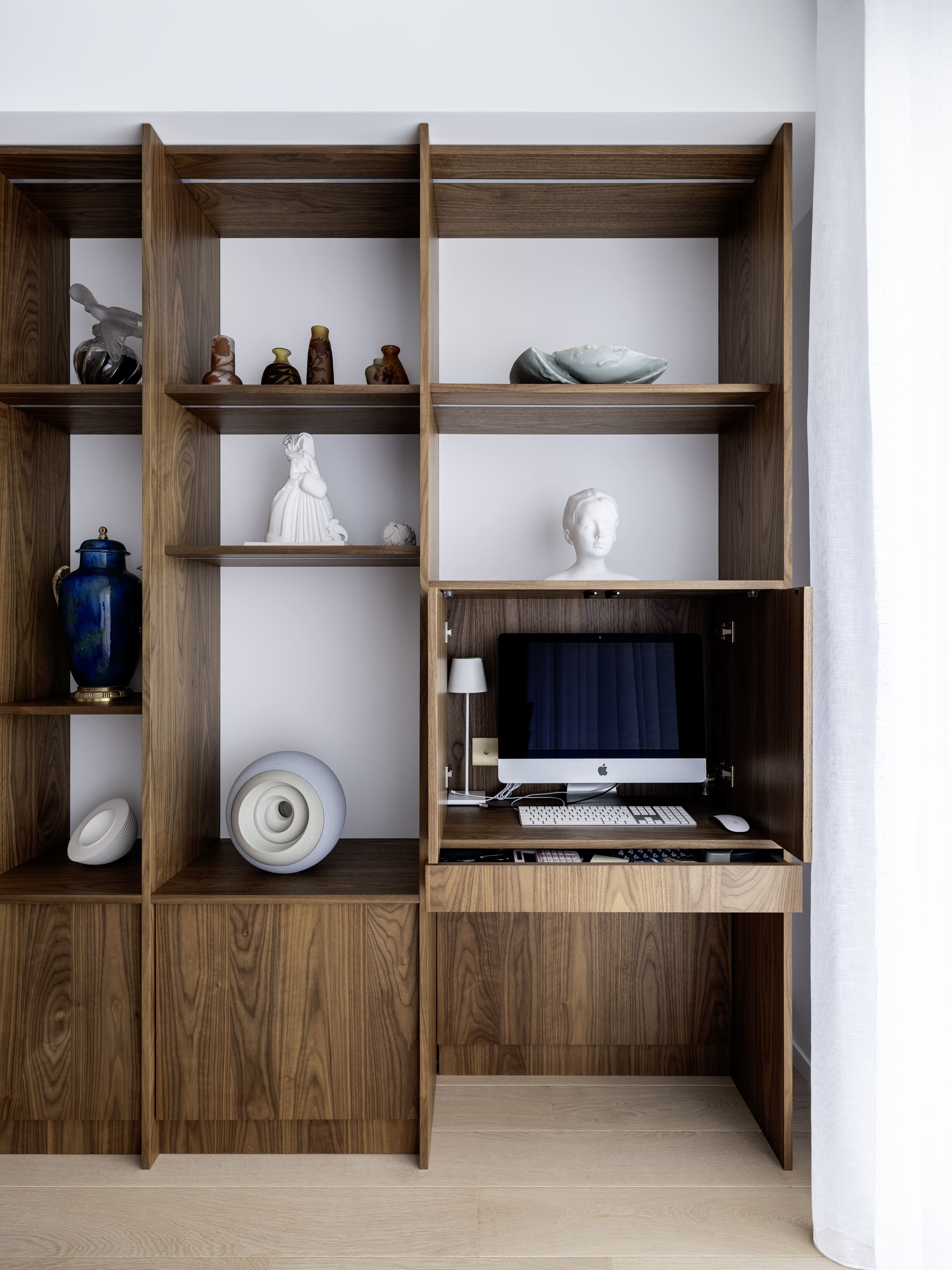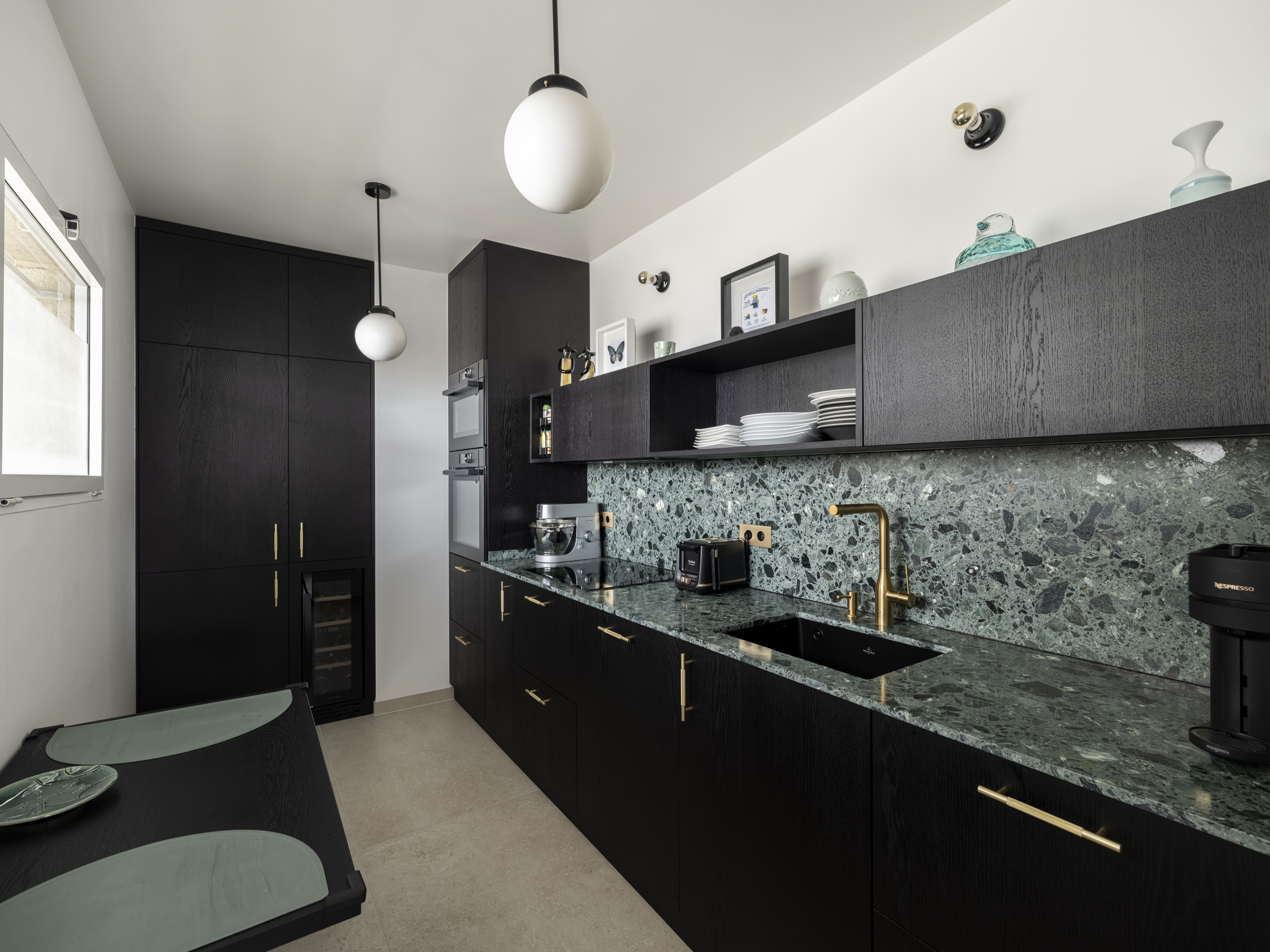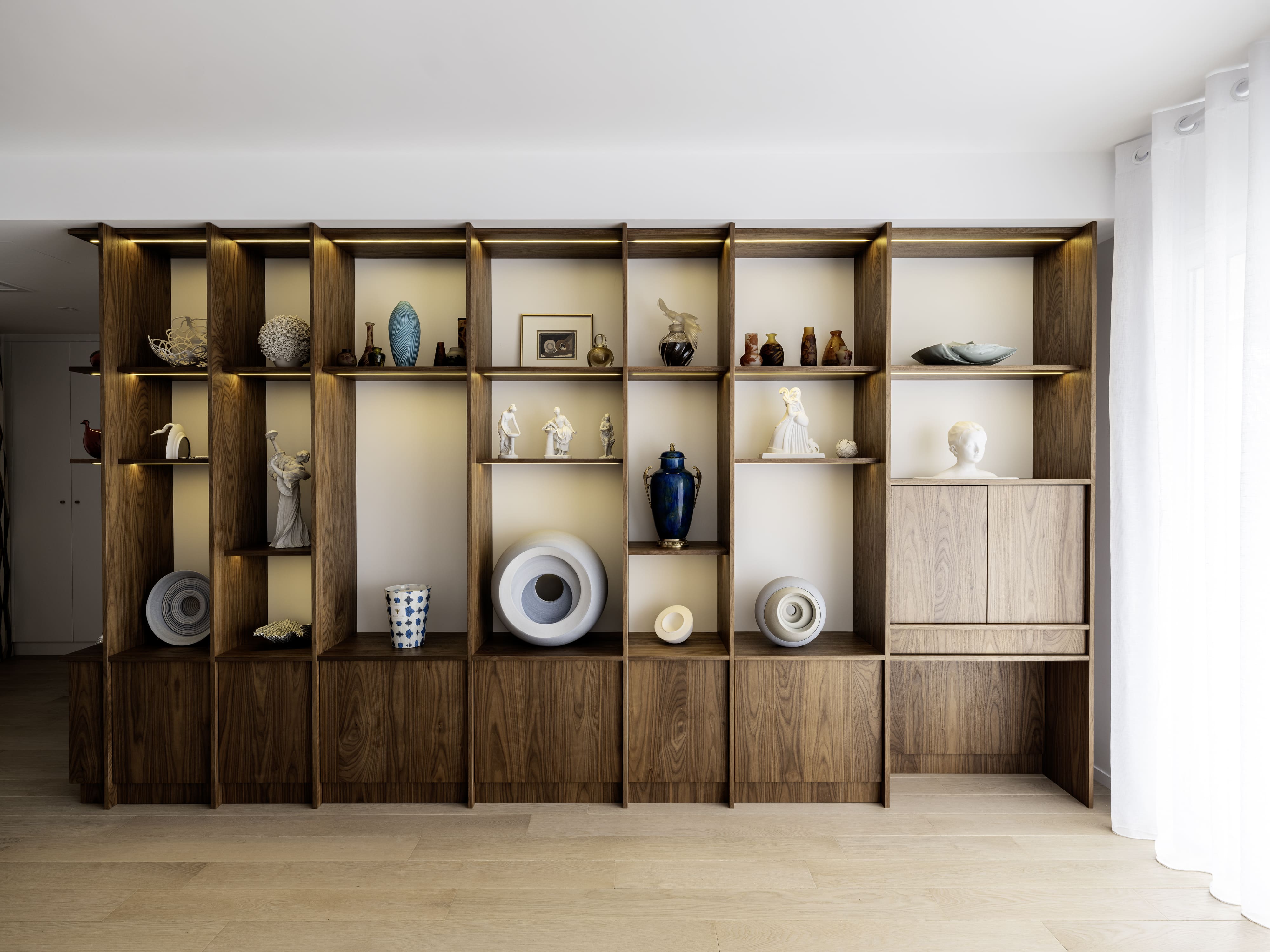 Aménagement intérieur sur mesure d’un appartement contemporain, alliant bois noble, pierre naturelle et finitions haut de gamme. Chaque élément a été conçu pour offrir un équilibre parfait entre esthétique, fonctionnalité et intégration dans l’espace.